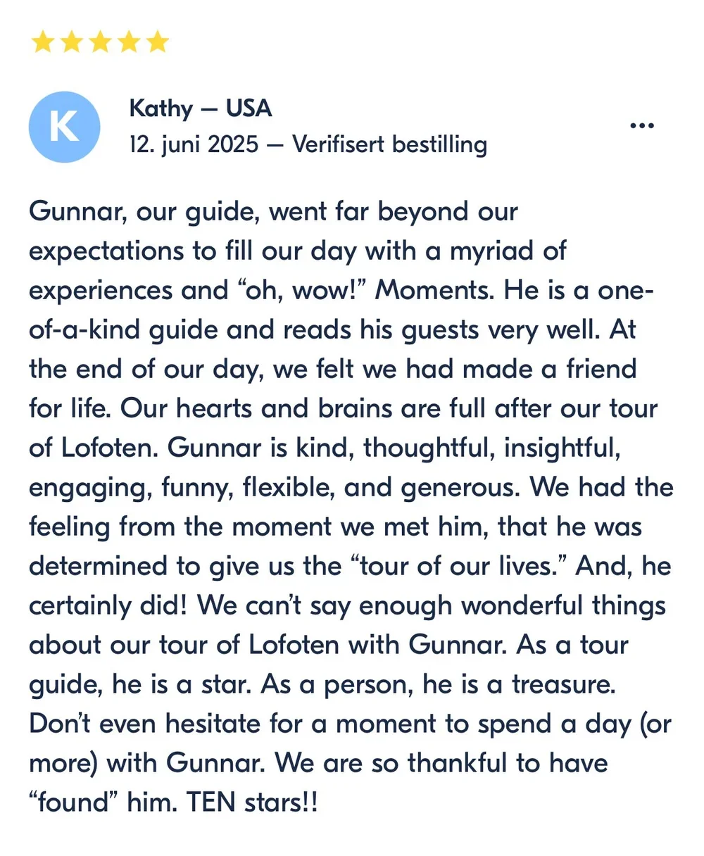 5 stars on Google, Tripadvisor and GetYourGuide from my guiding in Lofoten