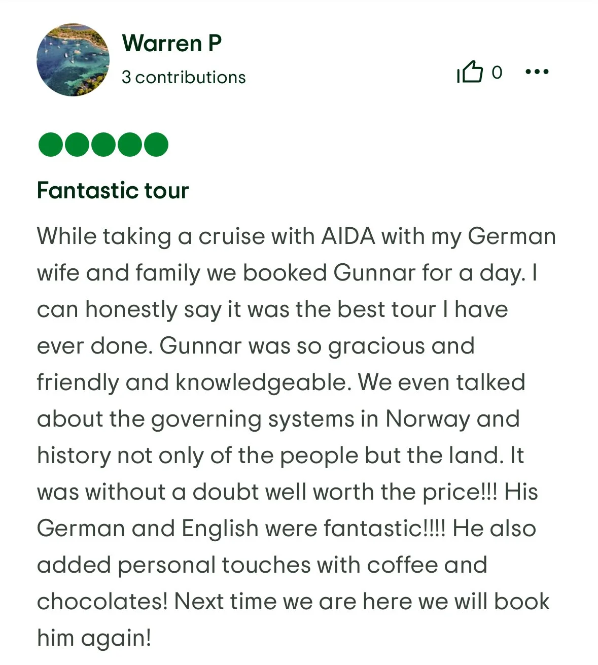 What started my passion for guiding? Well, it’s all those amazing travels I've taken, especially on cruises—which I absolutely love! When I come to a new place, I want to soak up the highlights, even if I’m short on time. Trust me, when it comes to destination Bergen, I've got your back!
